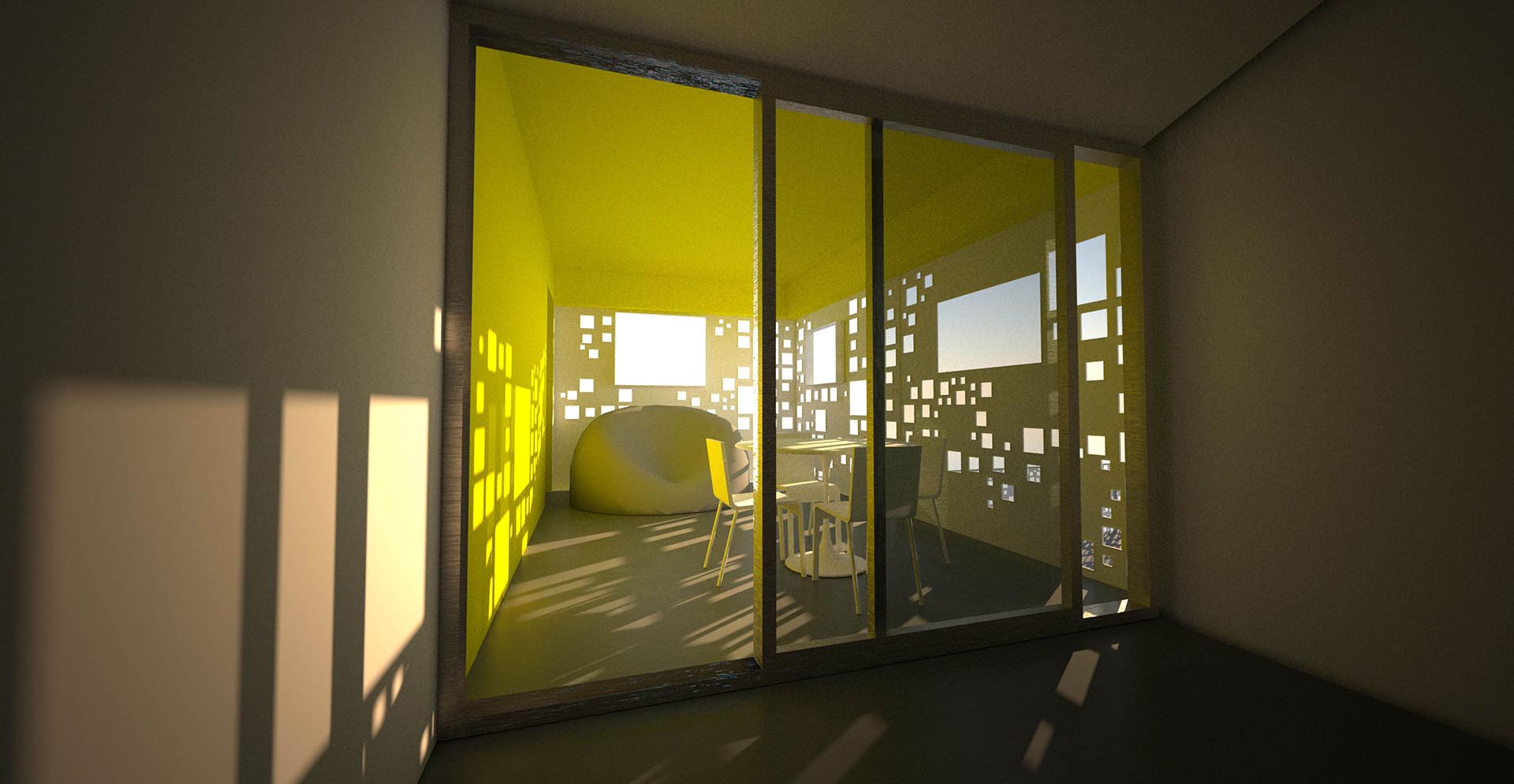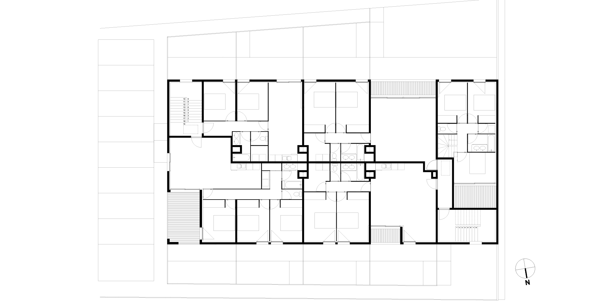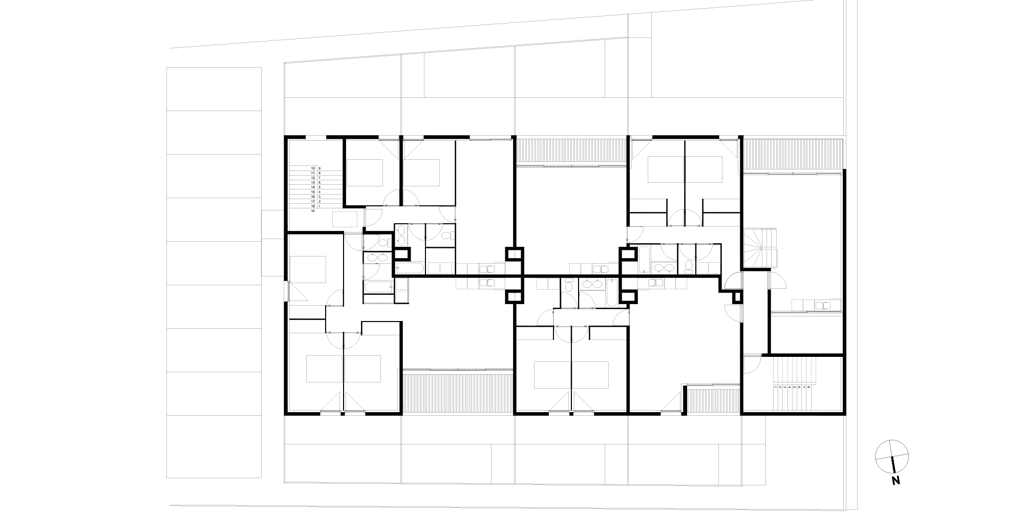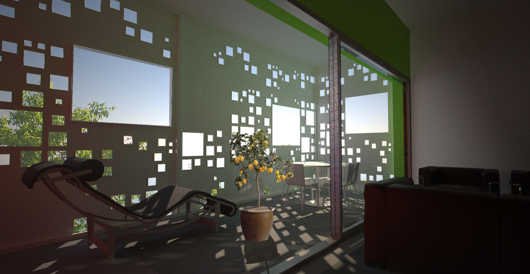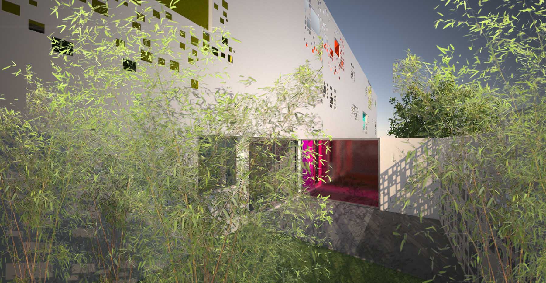 Un volume blanc et pur définit l'implantation du projet. De ce volume émergent seulement les touches colorées des terrasses qui se lisent à travers la perforation de la façade. Ce traitement donne un caractère homogène à l'opération et rend intime l'intégralité des logements.