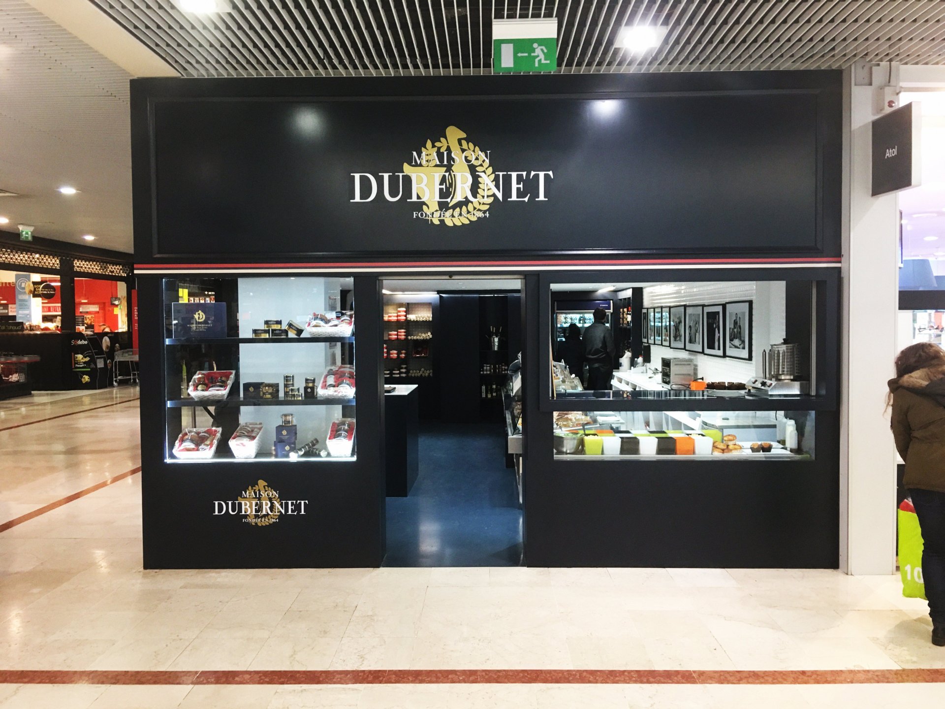 Une requalification architecturale a été demandée par la boutique Dubernet dans le centre commercial Mériadeck à Bordeaux afin de suivre les nouvelles directives de communication de la marque de tradition landaise fondée en 1864. Grâce à cela, la boutique de Mériadeck va être plus visible au public. Cette façade de couleur foncée permet de mettre en valeur le caractère contemporain de la marque tout en gardant un esprit de tradition souligné par les deux bandes de couleur ainsi que le logo doré de la Maison Dubernet.