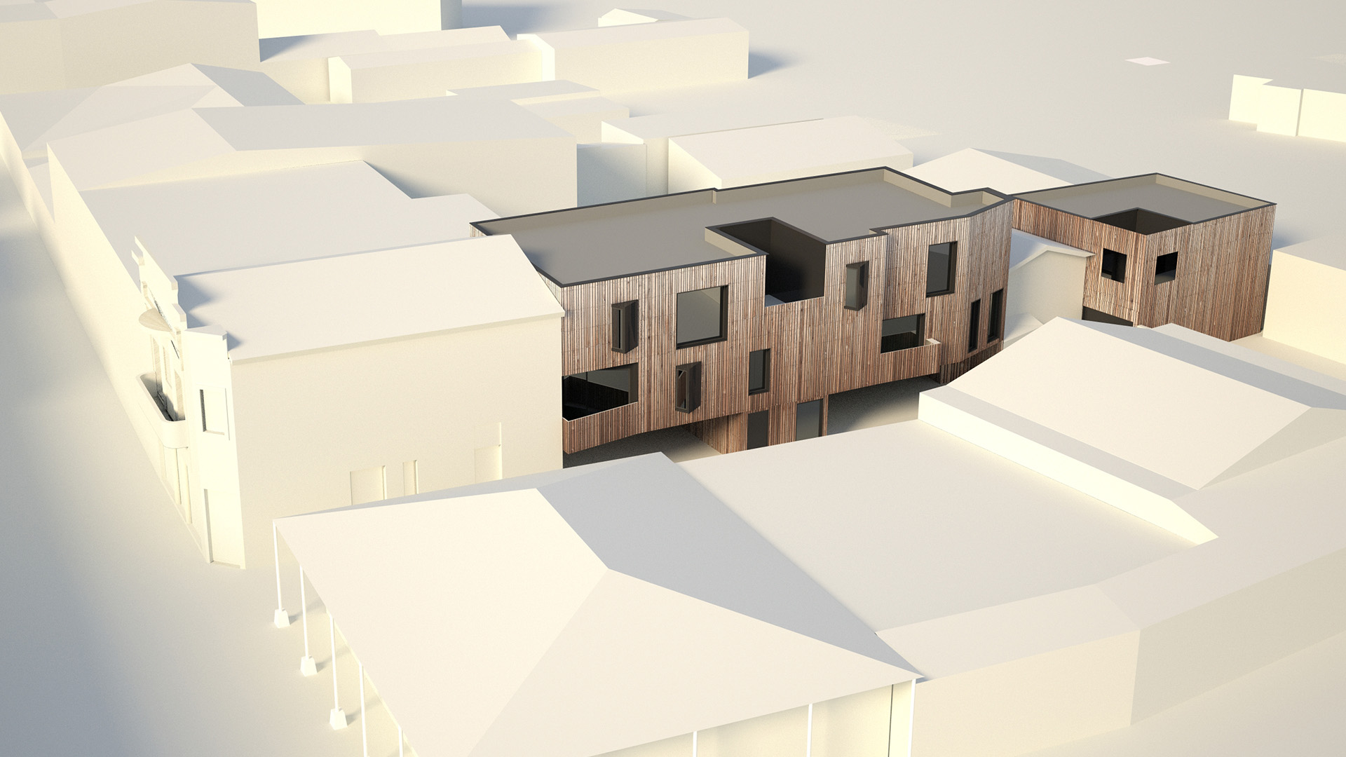 A quelques dizaines de mètres du Bassin d’Arcachon, le projet prend place dans une ruelle perpendiculaire à la rue piétonne si fréquentée en période estivale. La réhabilitation et l’extension du bâtiment existant doivent jouer avec l’étroitesse de la parcelle et l’unique orientation possible des ouvertures. Ainsi, le projet travaille sur un jeu de plein et de vides, alternant les terrasses en creux, les bow-windows et les grandes parois vitrées. La façade, recouverte de lames verticales en bois, semble onduler et se creuser dans la perspective de la ruelle.