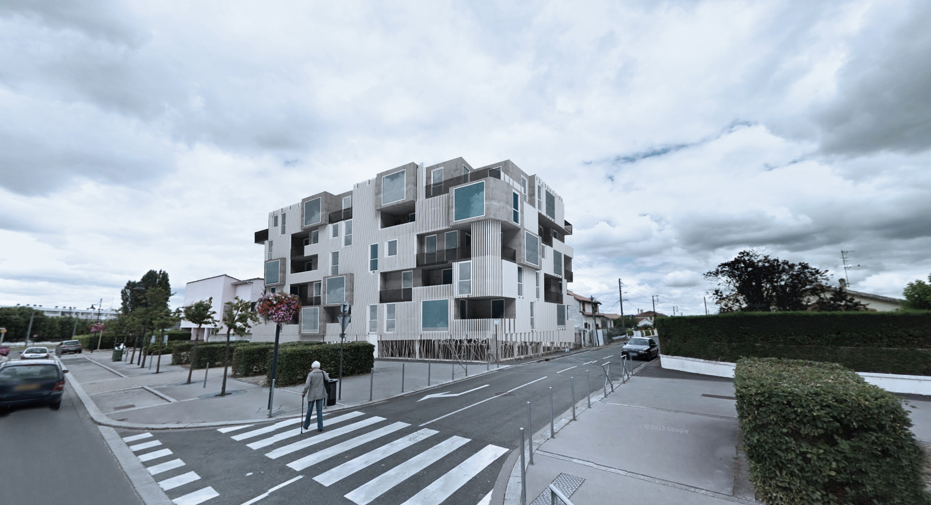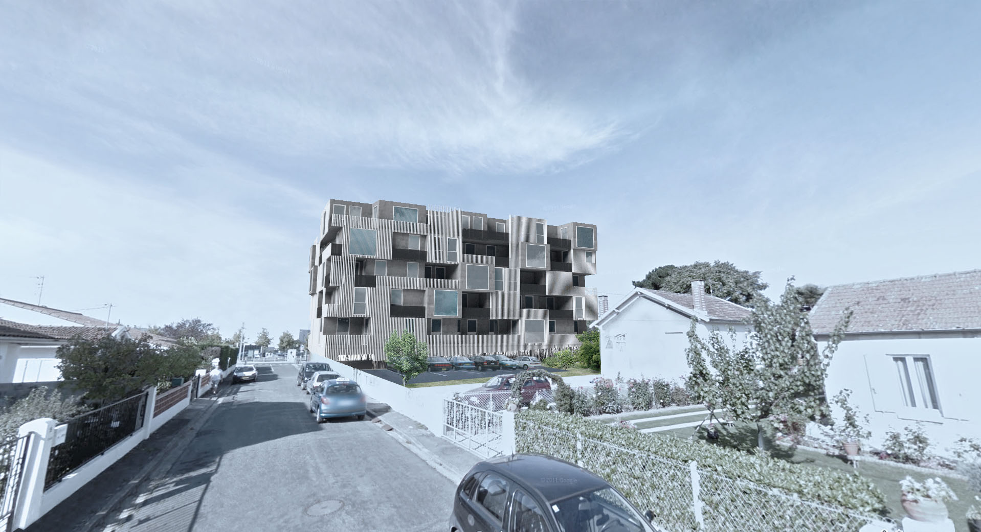 À Cenon, à l’angle des rues Camille Pelletan et Saint Saens, se situe le projet de 35 logements. Le RDC est occupé par des places de stationnement. Ses façades sont conçues par une maille de manière à décoller le bâtiment du sol et créer un lien avec la rue. Les étages, composés des logements, sont décalés les uns par rapport aux autres, de façon à générer des jeux de volumes. Ce contraste entre plein et vide et ce décalage d’un étage à un autre donne un dynamisme aux façades et diminue ainsi l’impact visuel de l’immeuble pour mieux l’intégrer à son voisinage composé d’habitats pavillonnaires. Le dynamisme des façades est accentué par le contraste entre les trois matériaux : le bardage métallique blanc rythmé créant une continuité, le béton qui perce localement le bardage pour laisser apparaître des volumes en saillie ou en retrait, et le verre des garde-corps et des ouvertures. Les logements variés, allant du T1 au T4, sont conçus de manière à avoir tous un espace extérieur généré par le jeu de volumes.