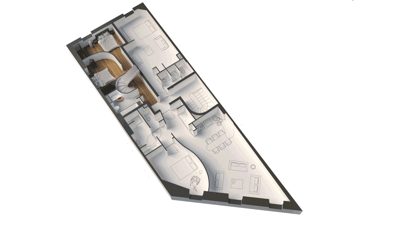 La réhabilitation de cet immeuble bordelais typique était l'occasion de redonner vie à une batisse dont l'aménagement ne correspondait plus aux usages. Chaque étage est donc devenu un plateau libre dans lequel 3 appartements prennent possession des lieux. Le dernier niveau, sous les combles, est aussi exploité : une terrasse tropézienne est creusée dans la toiture existante pour donner un espace extérieur au luxueux duplex du dernier étage.