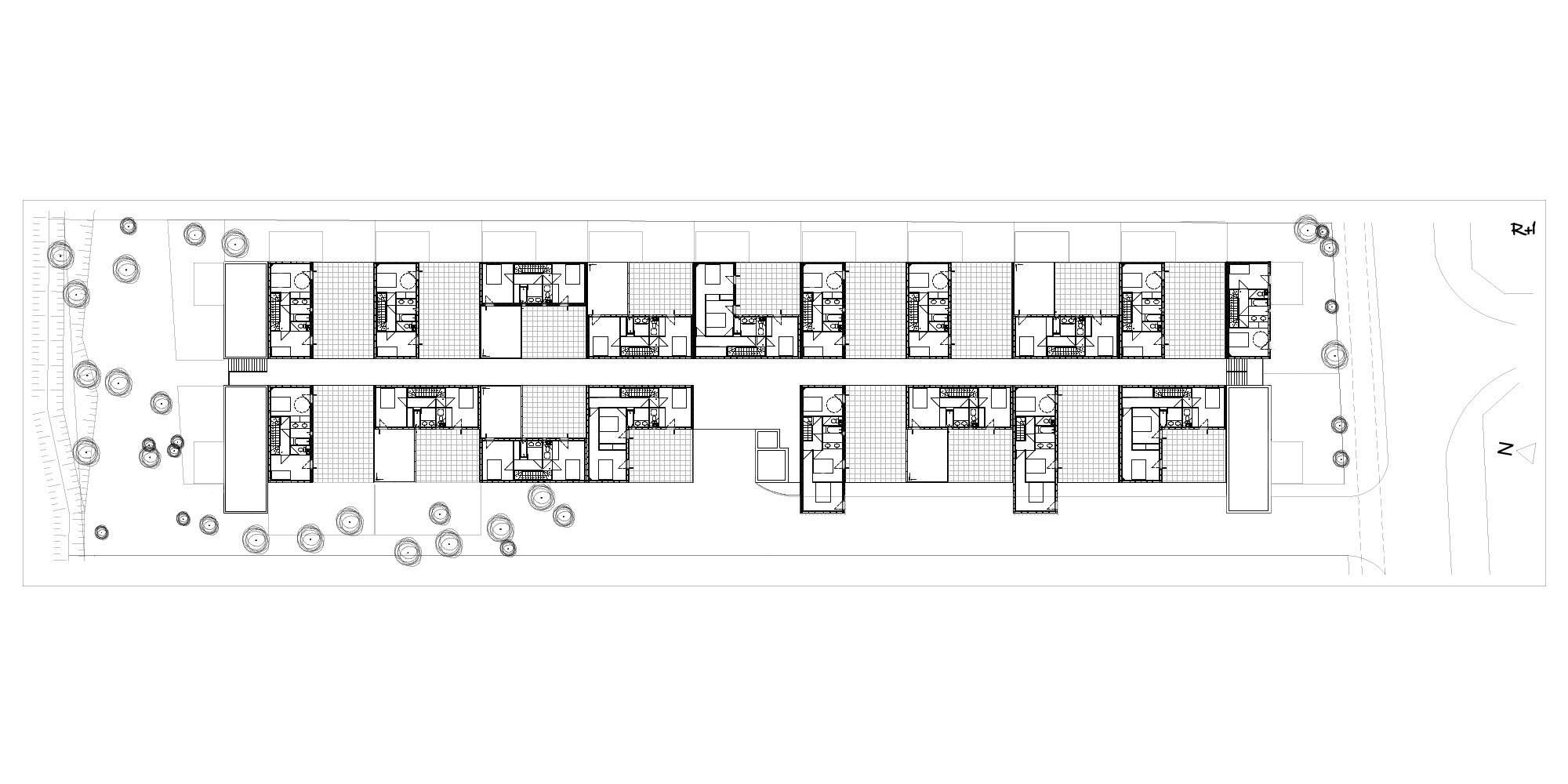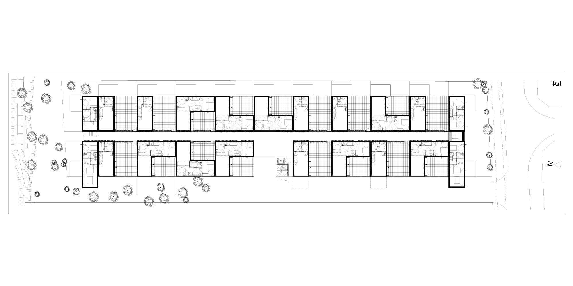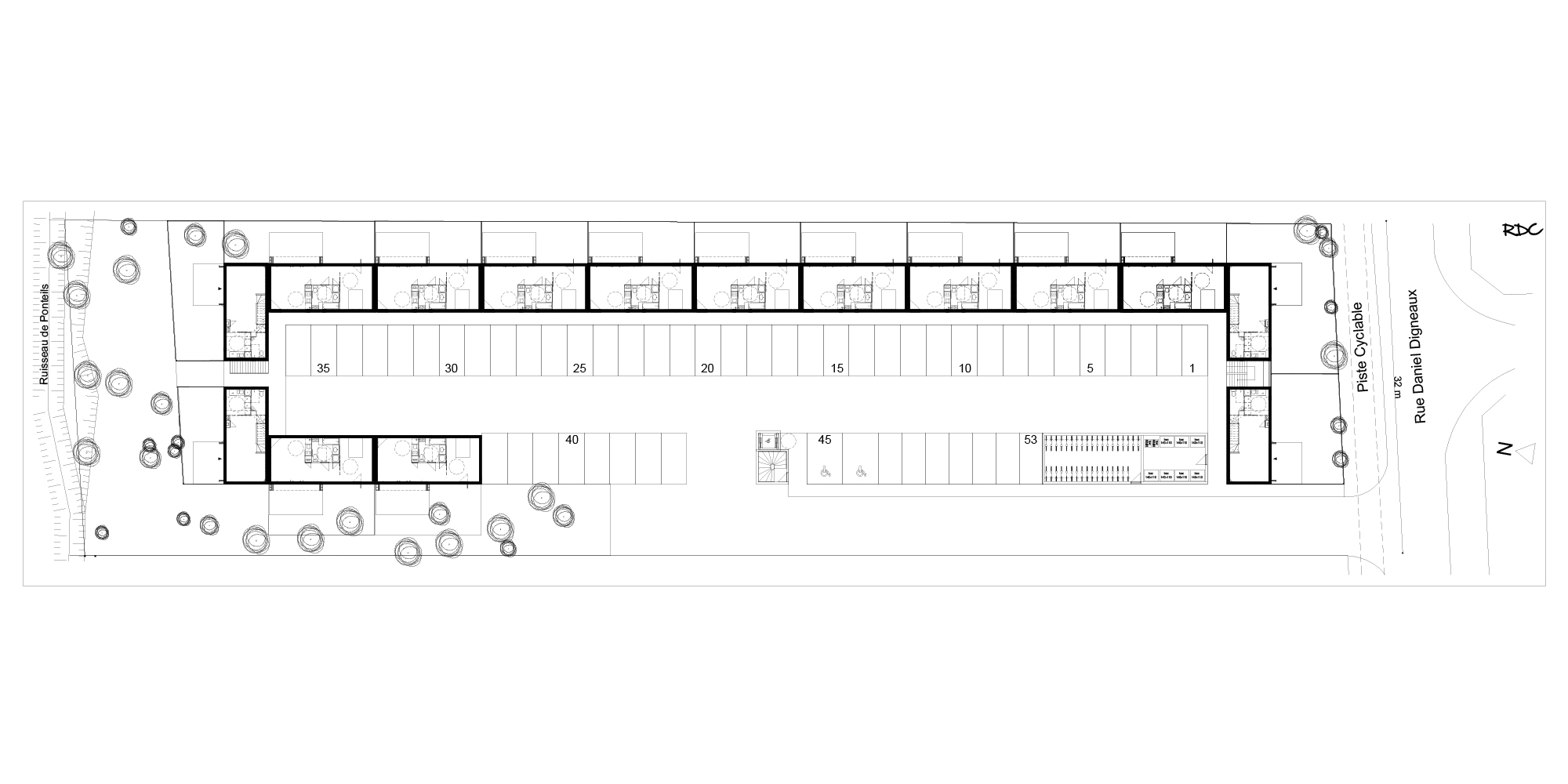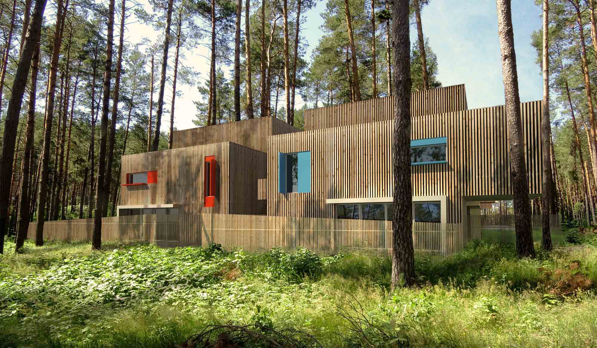 Ce projet de 31 maisons individuelles s’implante sur un vaste terrain boisé, à quelques kilomètres de l’océan. Cet environnement naturel d’excellence détermine donc l’esprit du projet. Les façades en bois sont rythmées par des jeux de volumes et de couleurs pour s’intégrer à la nature et permettre des respirations. Une rue intérieure est créée au cœur du projet afin de prolonger la promenade naturelle en une promenade architecturale. Ce parcours est séquencé par le jeu de volumes et de percées visuelles. Chaque logement possède un accès privatif et un espace extérieur intimisé. Les ouvertures colorées qui rythment la façade créent aussi des cadrages vers la nature environnante. Par l’implantation des volumes et leurs agencement, l’ensemble permet de concilier nature et architecture.