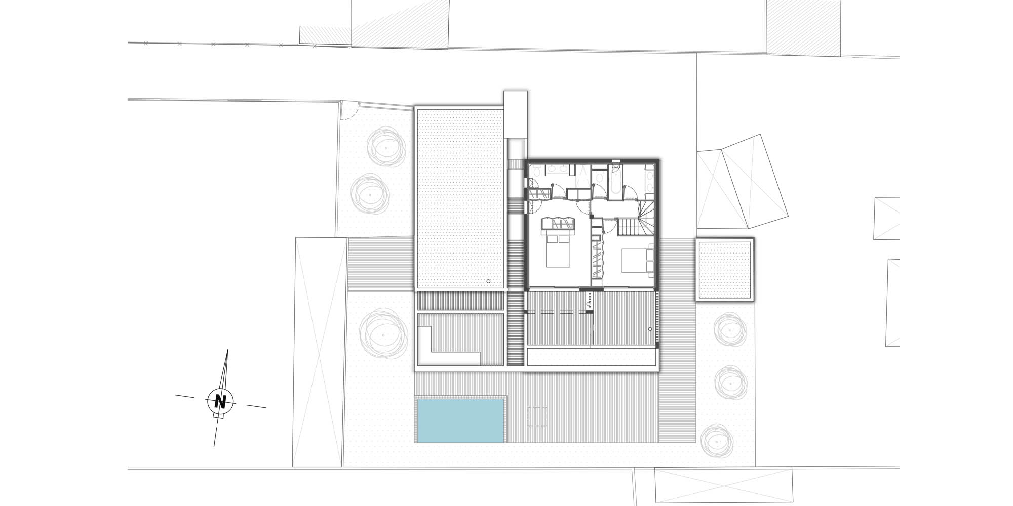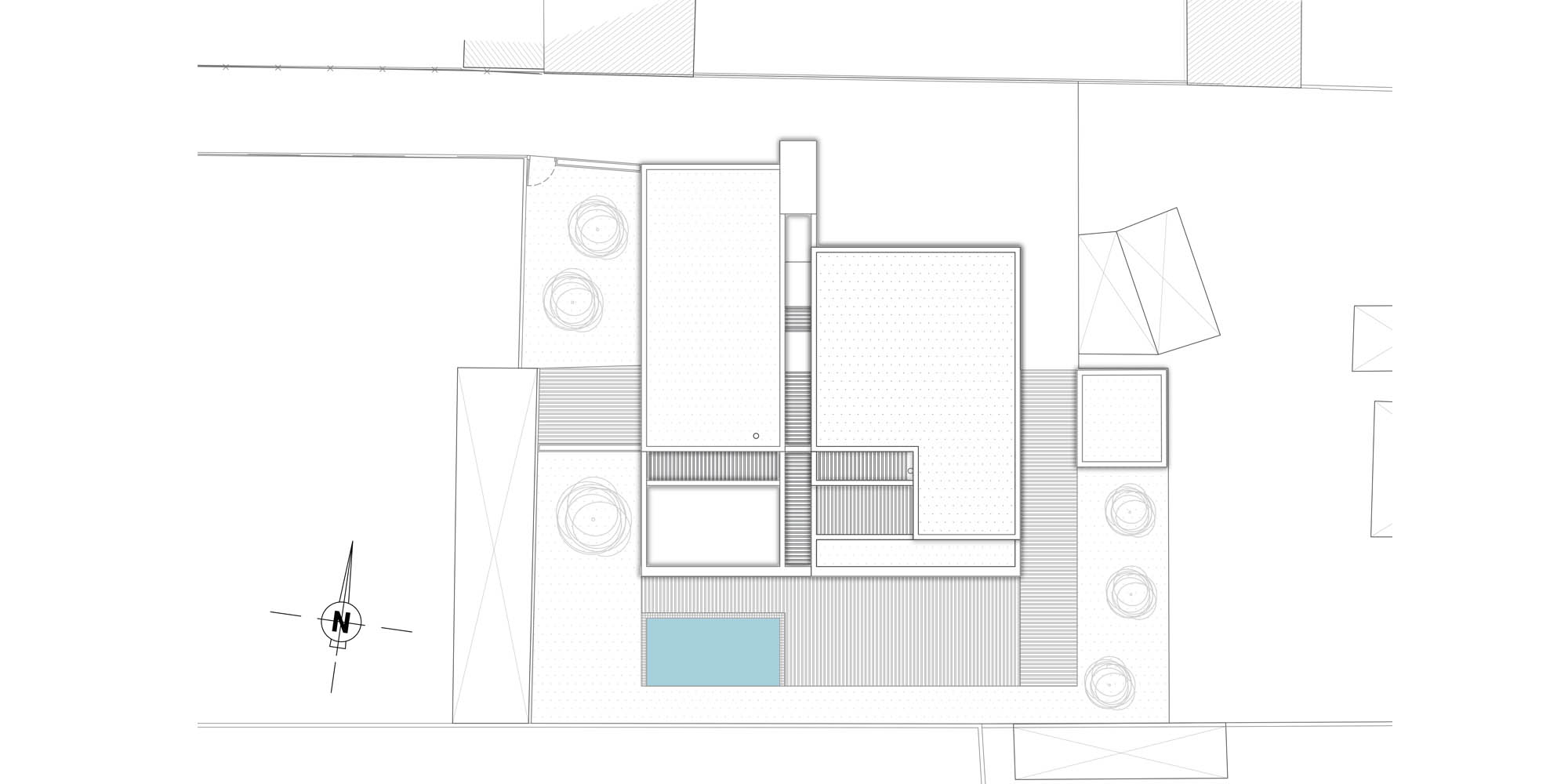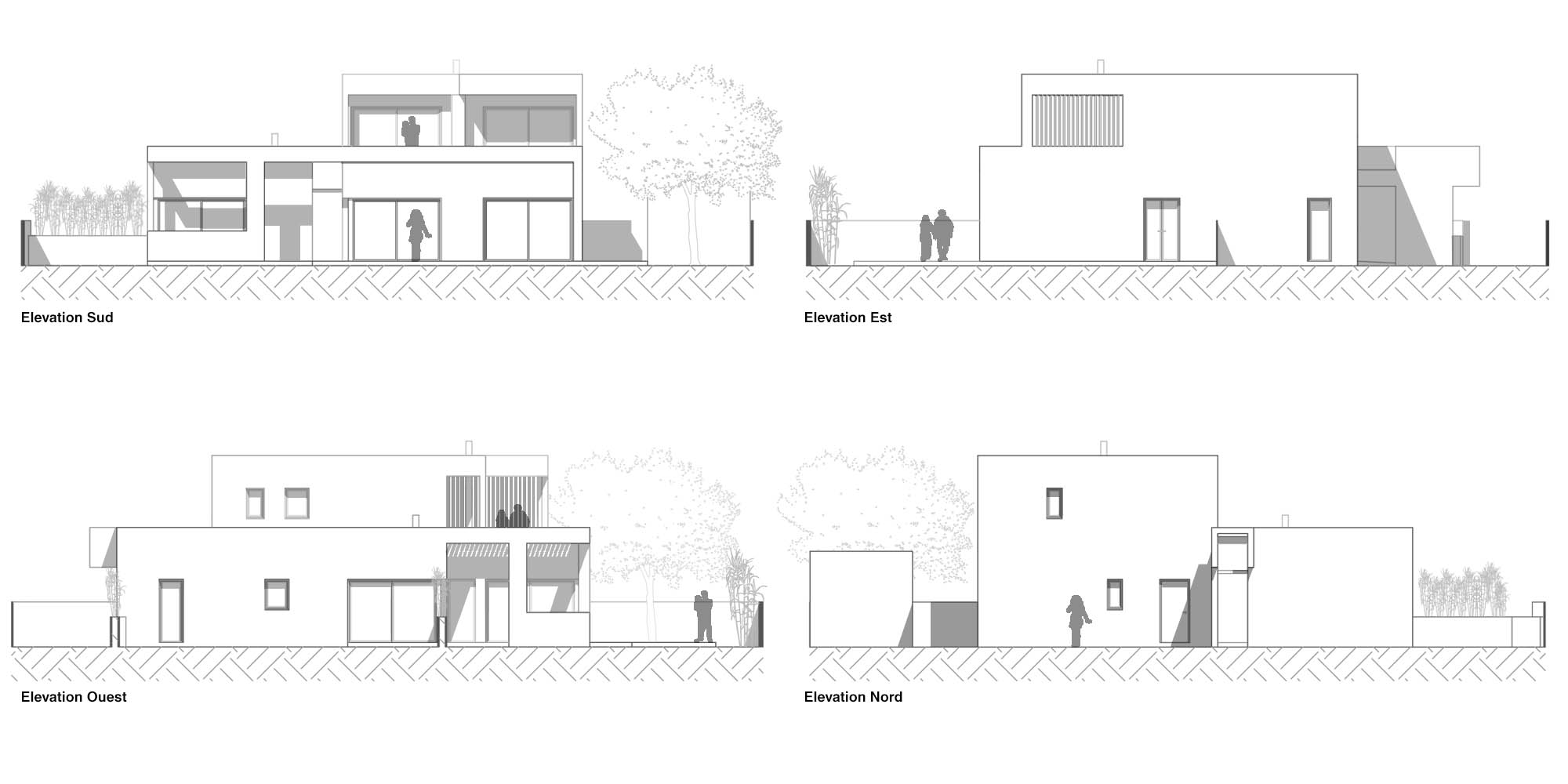 La maison se compose de volumes simples recouverts de béton. Les rapports d'emprise, de hauteur et de distance entre les volumes génèrent des situations et des ambiances différentes au sein du projet.