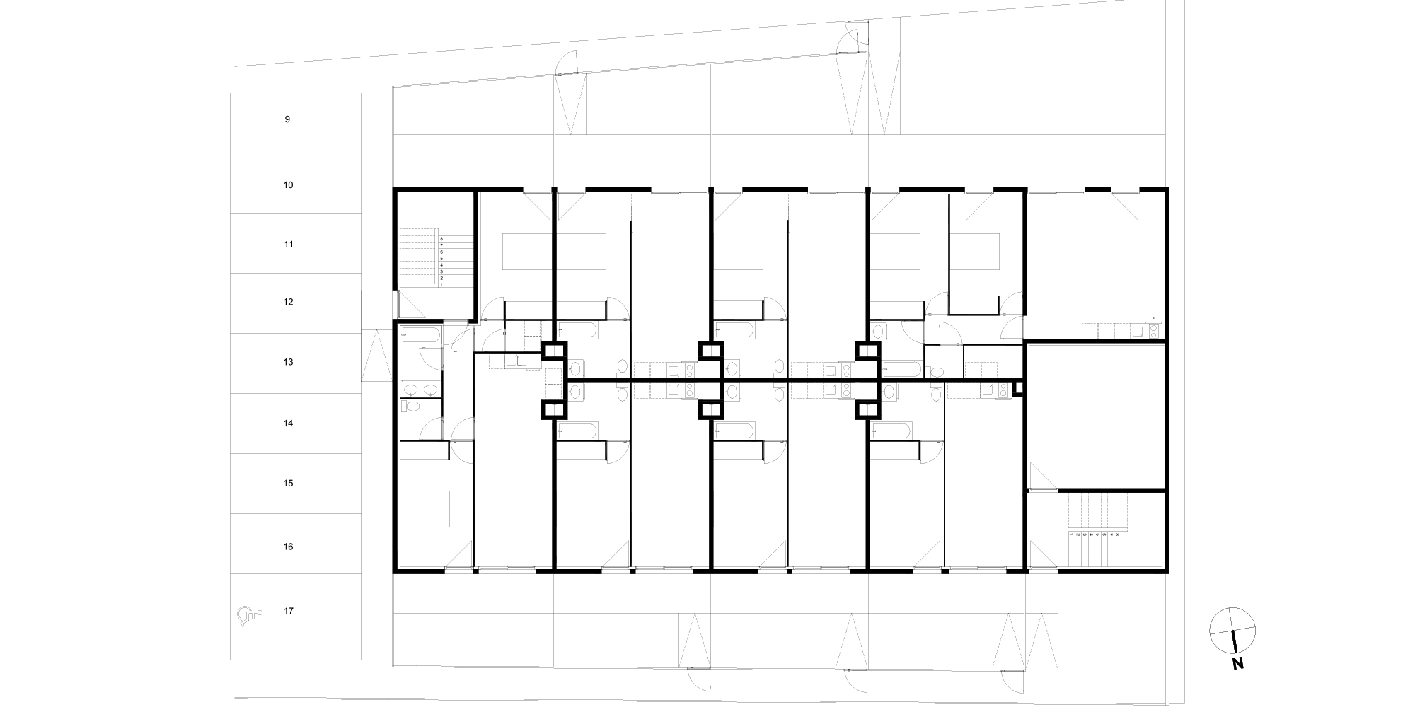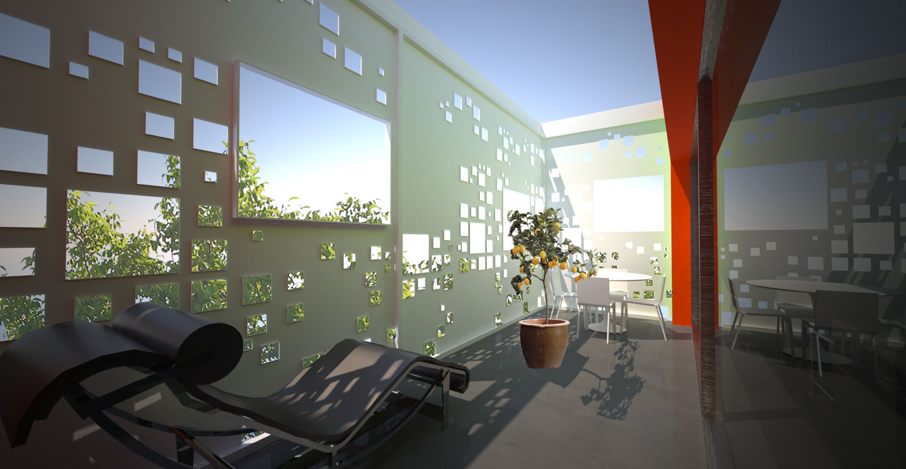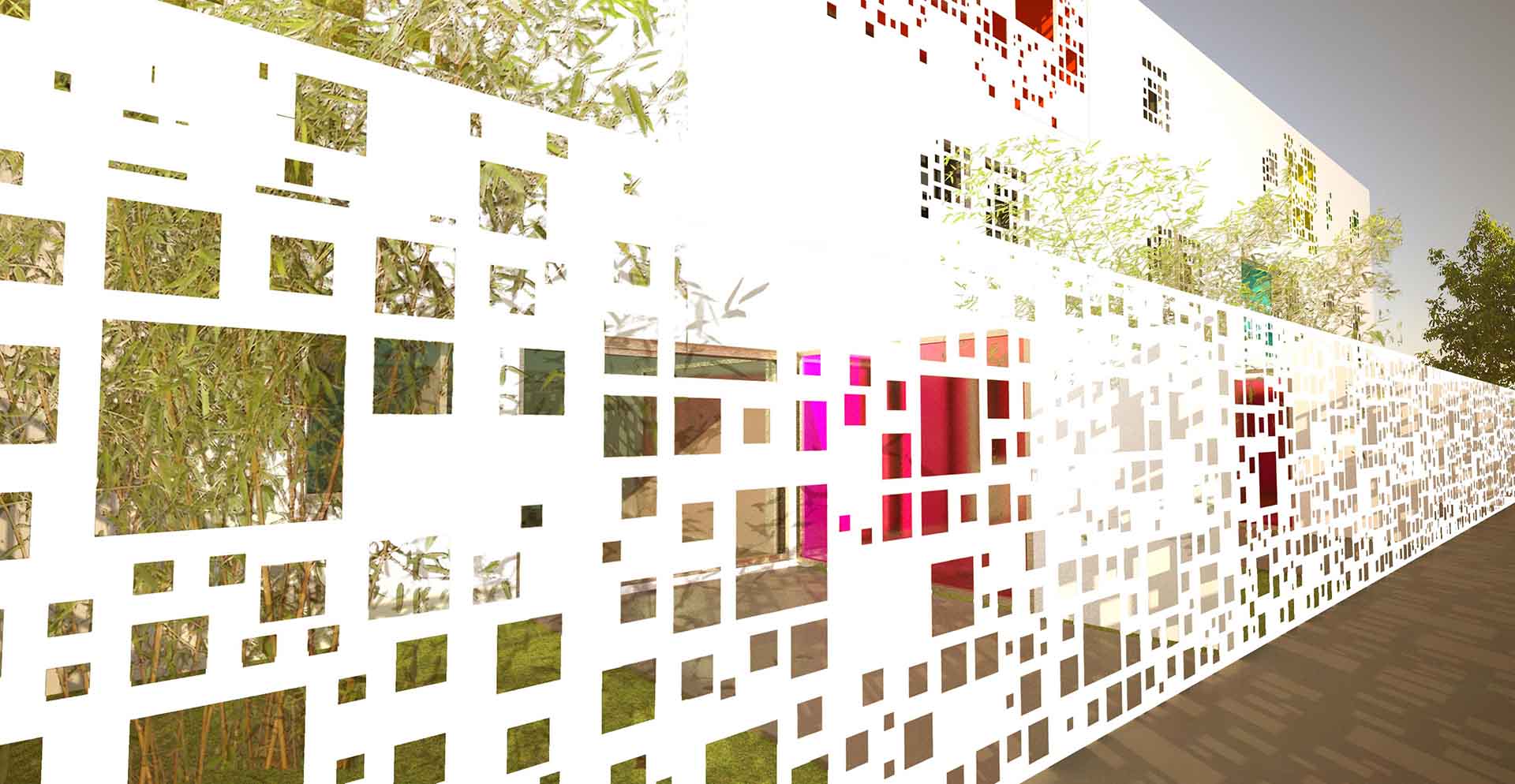 Un volume blanc et pur définit l'implantation du projet. De ce volume émergent seulement les touches colorées des terrasses qui se lisent à travers la perforation de la façade. Ce traitement donne un caractère homogène à l'opération et rend intime l'intégralité des logements.