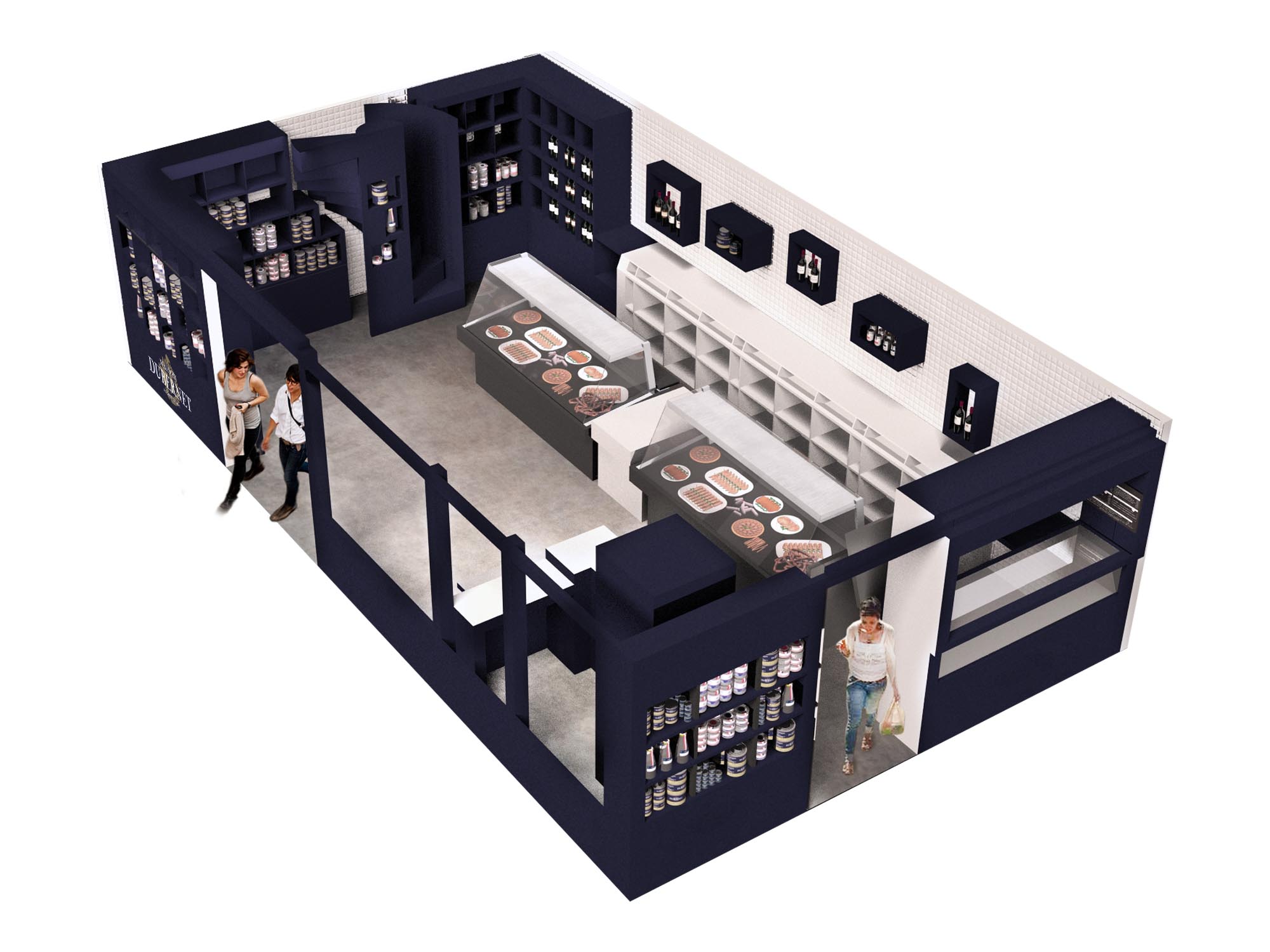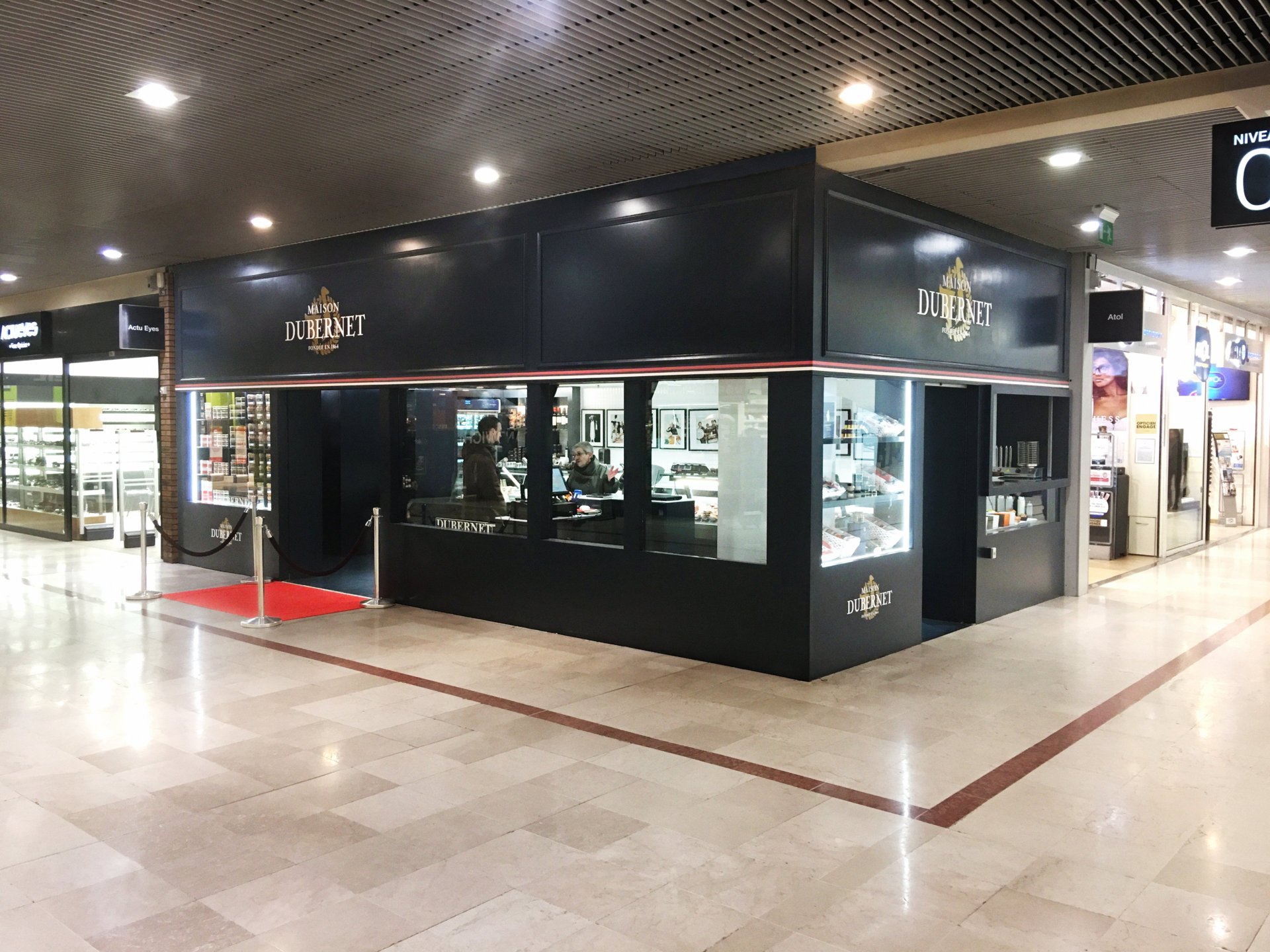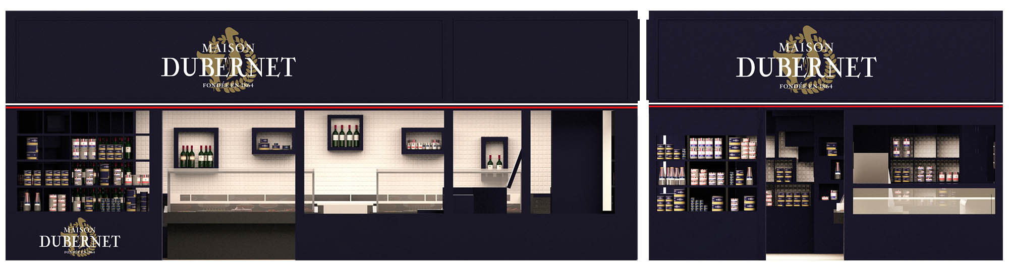Une requalification architecturale a été demandée par la boutique Dubernet dans le centre commercial Mériadeck à Bordeaux afin de suivre les nouvelles directives de communication de la marque de tradition landaise fondée en 1864. Grâce à cela, la boutique de Mériadeck va être plus visible au public. Cette façade de couleur foncée permet de mettre en valeur le caractère contemporain de la marque tout en gardant un esprit de tradition souligné par les deux bandes de couleur ainsi que le logo doré de la Maison Dubernet.