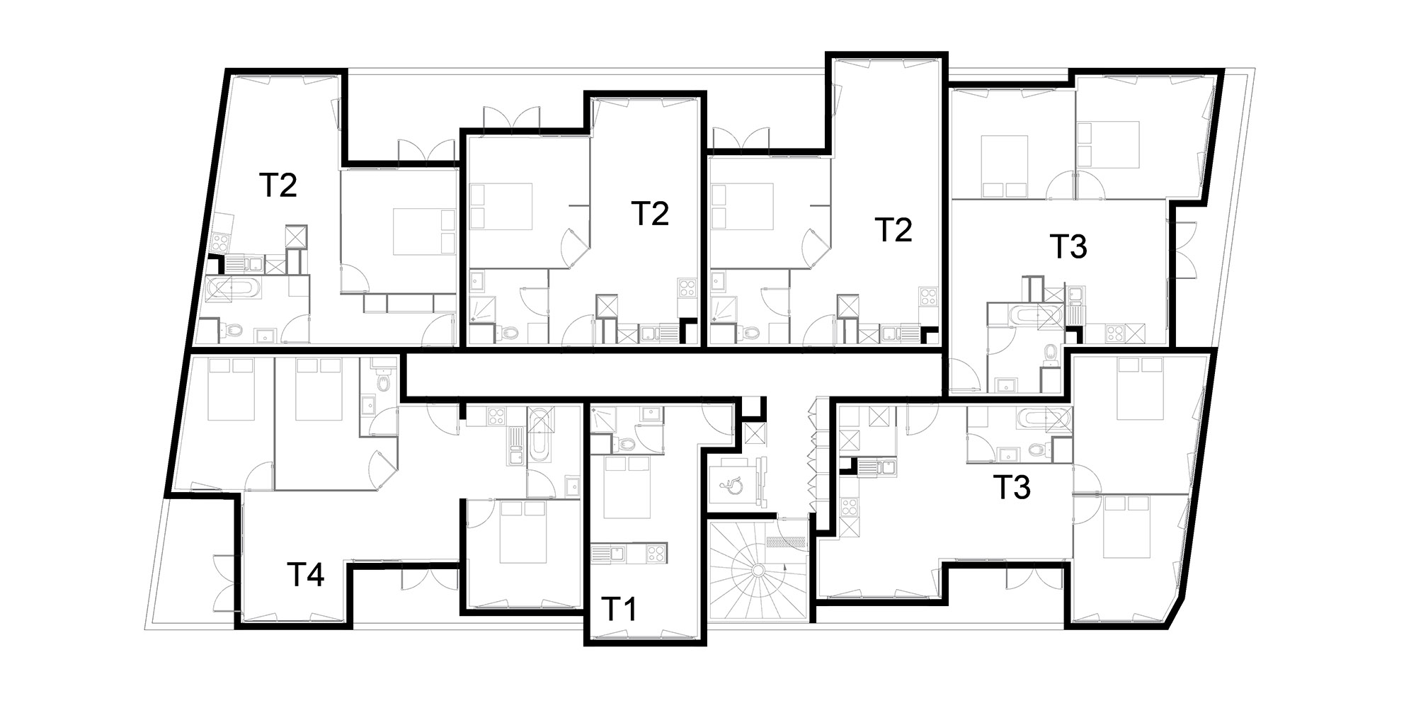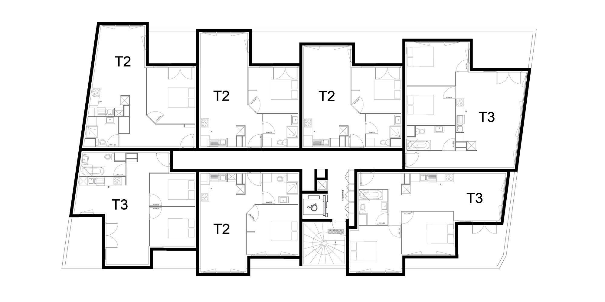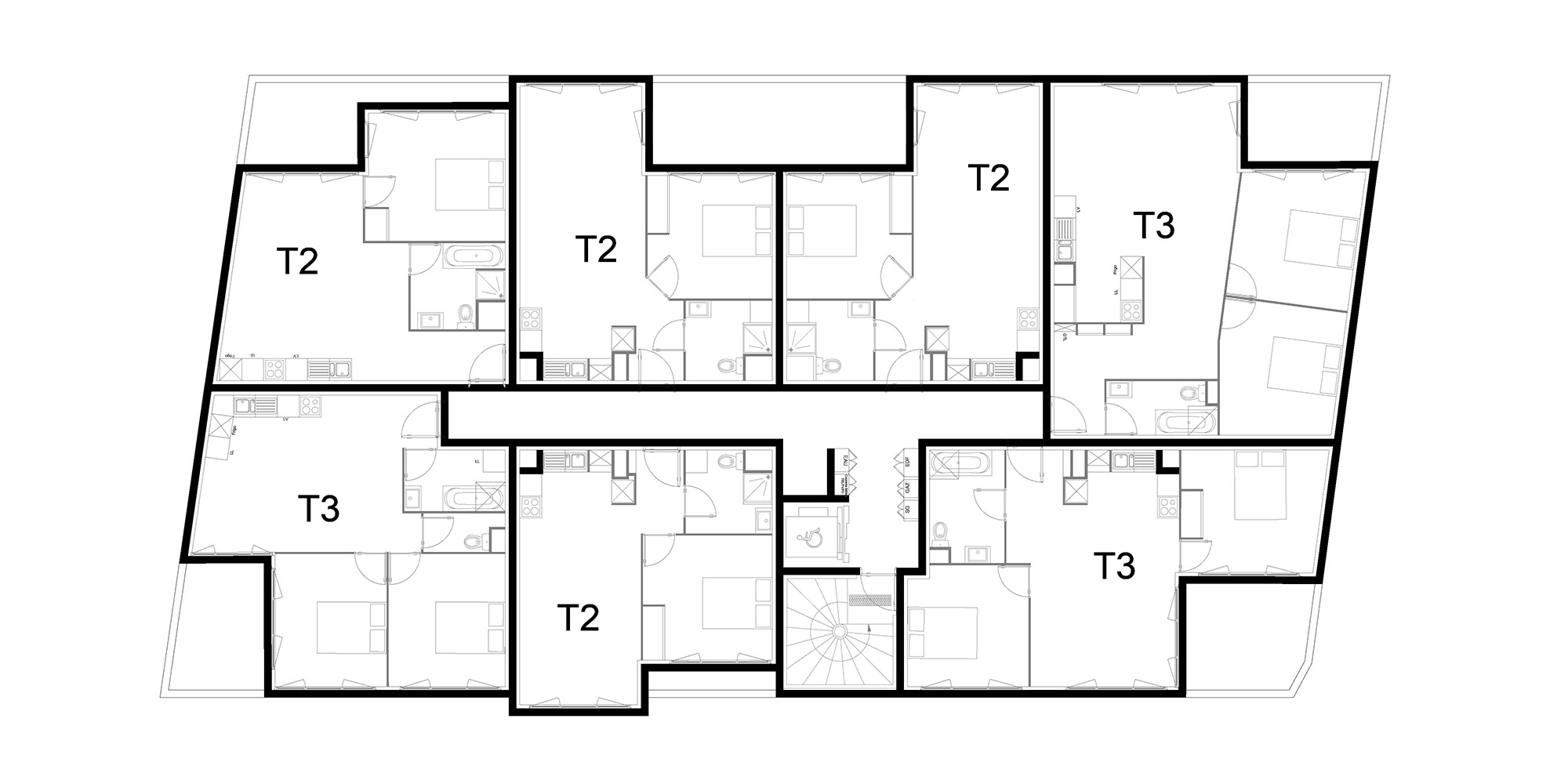 À Cenon, à l’angle des rues Camille Pelletan et Saint Saens, se situe le projet de 35 logements. Le RDC est occupé par des places de stationnement. Ses façades sont conçues par une maille de manière à décoller le bâtiment du sol et créer un lien avec la rue. Les étages, composés des logements, sont décalés les uns par rapport aux autres, de façon à générer des jeux de volumes. Ce contraste entre plein et vide et ce décalage d’un étage à un autre donne un dynamisme aux façades et diminue ainsi l’impact visuel de l’immeuble pour mieux l’intégrer à son voisinage composé d’habitats pavillonnaires. Le dynamisme des façades est accentué par le contraste entre les trois matériaux : le bardage métallique blanc rythmé créant une continuité, le béton qui perce localement le bardage pour laisser apparaître des volumes en saillie ou en retrait, et le verre des garde-corps et des ouvertures. Les logements variés, allant du T1 au T4, sont conçus de manière à avoir tous un espace extérieur généré par le jeu de volumes.