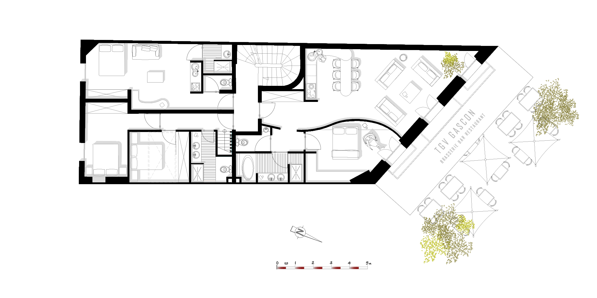 La réhabilitation de cet immeuble bordelais typique était l'occasion de redonner vie à une batisse dont l'aménagement ne correspondait plus aux usages. Chaque étage est donc devenu un plateau libre dans lequel 3 appartements prennent possession des lieux. Le dernier niveau, sous les combles, est aussi exploité : une terrasse tropézienne est creusée dans la toiture existante pour donner un espace extérieur au luxueux duplex du dernier étage.