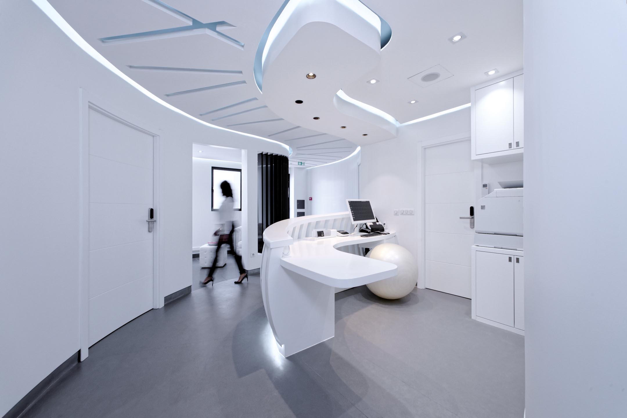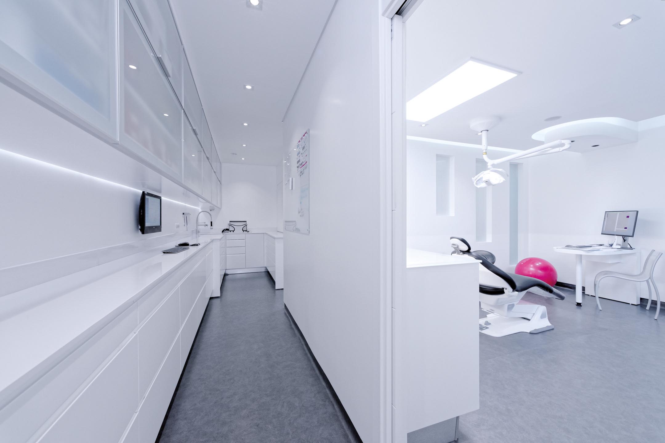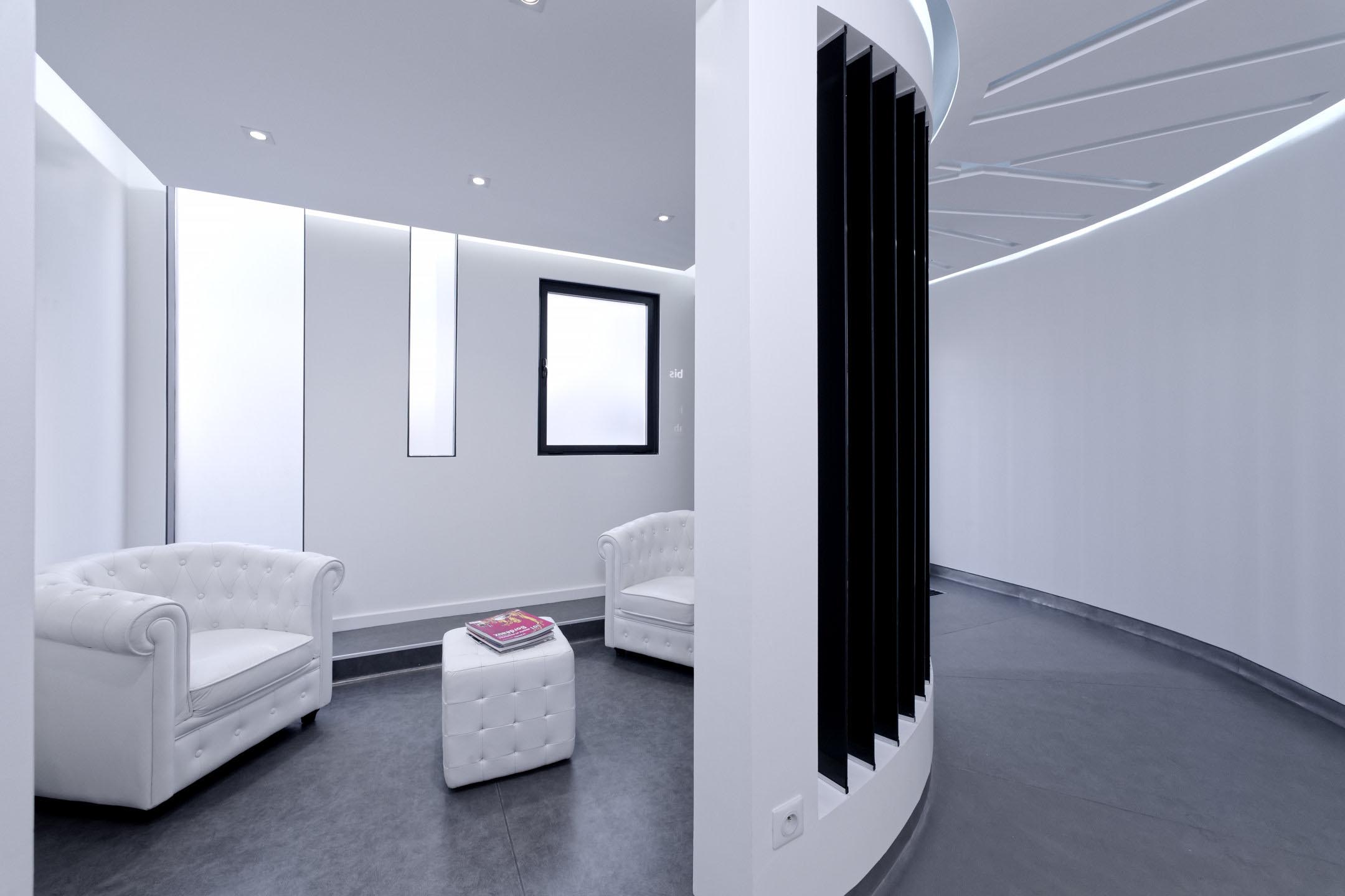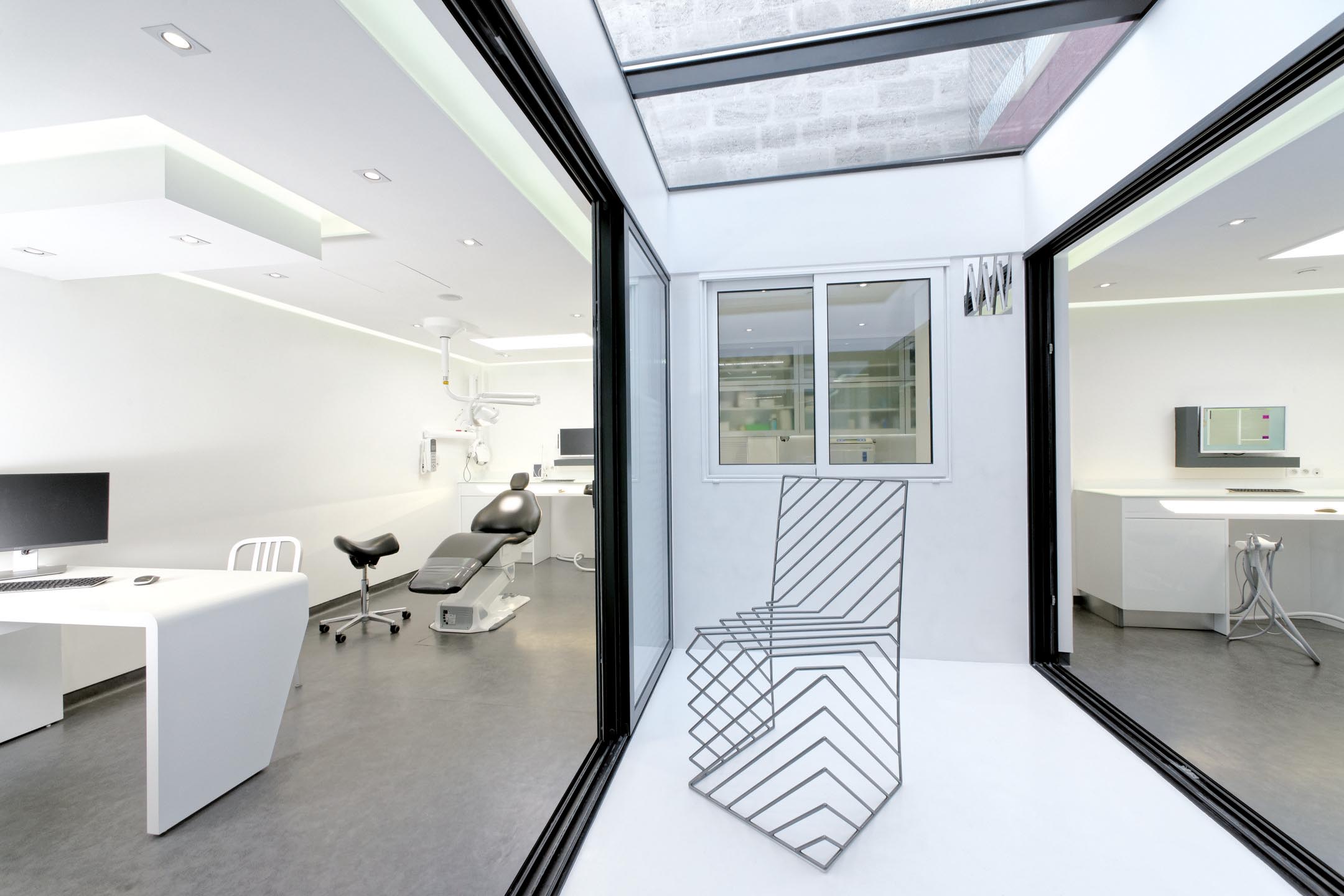 Un puits de jour a été créé au fond du local pour éclairer les deux autres cabinets de soins et pour en faire un lieu de vie au sein du cabinet dentaire.