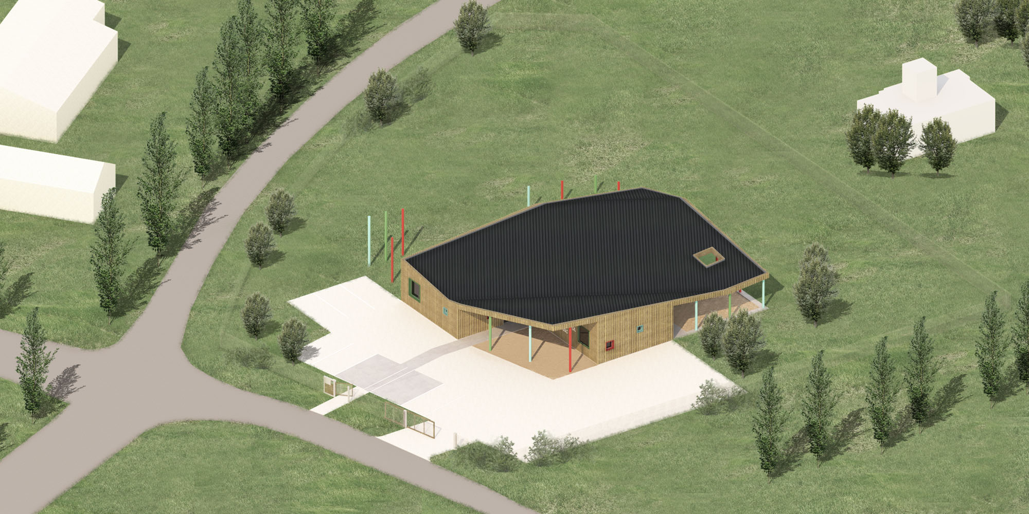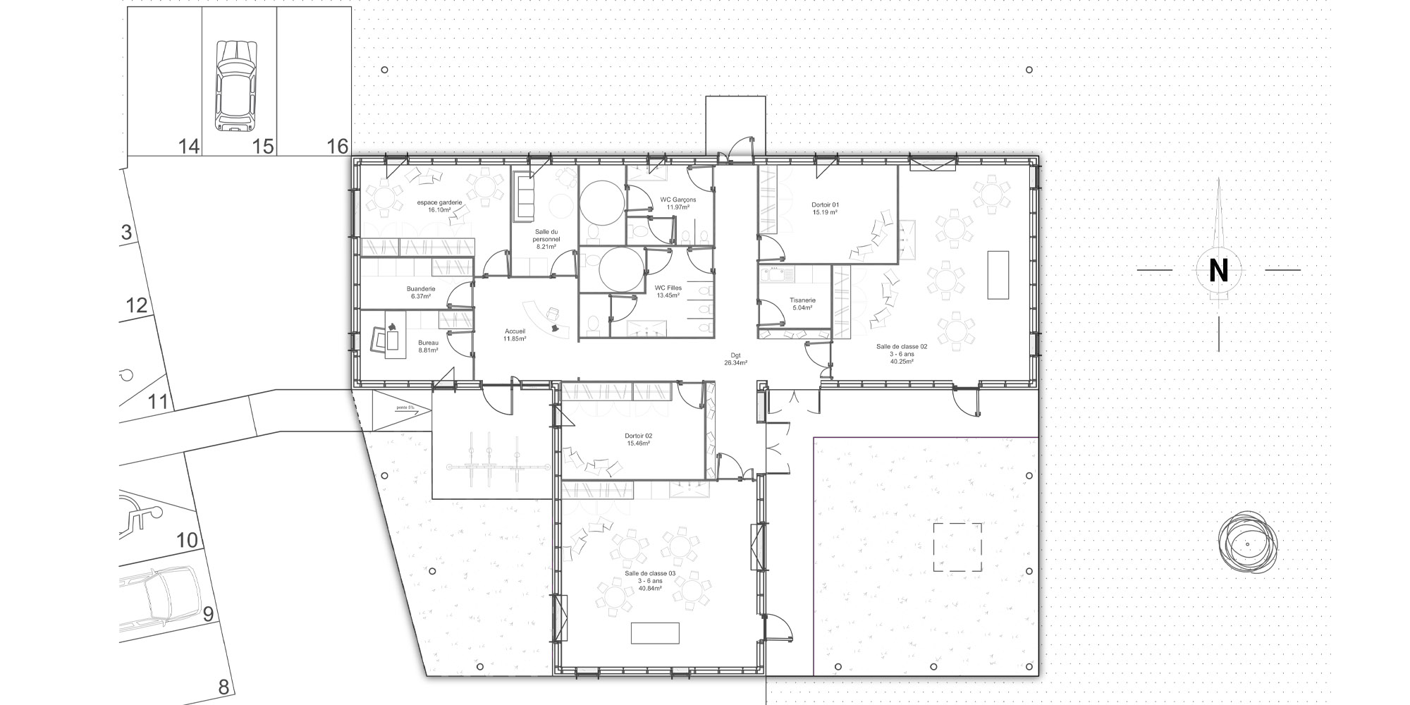 Le projet se nourrit de cette philosophie pour définir sa composition et son organisation : le travail à partir d'une trame régulière permet de générer un plan évolutif. Les salles de classes se trouvent dans les branches du T, tout en définissant des espaces extérieurs aux angles. Une salle de classe supplémentaire est facilement constructible sur la façade nord pour définir un plan en croix.