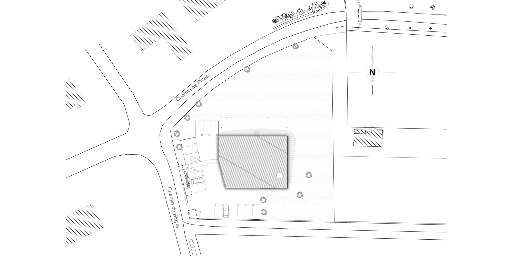 Le volume très simple est recouvert d'une toiture à 3 pentes, tourné à 30 degré de l'axe du volume. Cela permet de signifer des espaces plus ou moins intimes avec des hauteurs sous plafond variables, et de travailler sur des perceptions d'espaces différents.